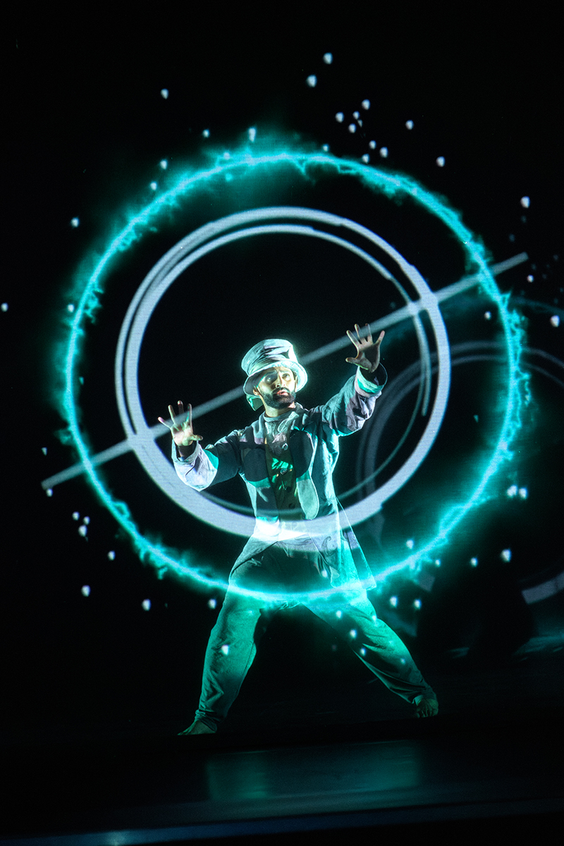 Joss: “The whole concept of multimedia was the real starting point for us. And when we were thinking about if we’re going to tell a narrative story, we thought what characters could create this kind of spectacle. As well as, what if it’s going to be a solo show? What kind of character could really hold a space for an hour? The Mad Hatter has always been really fascinating to me and what you can do with the Hatter. There have been loads of interpretations over the years, but we spent a lot of time thinking about what makes this character unique and how can we make him relevant. We did a lot of development work when we were making the show with kids in schools and making sure that what we were creating was really relevant for our target audience.
