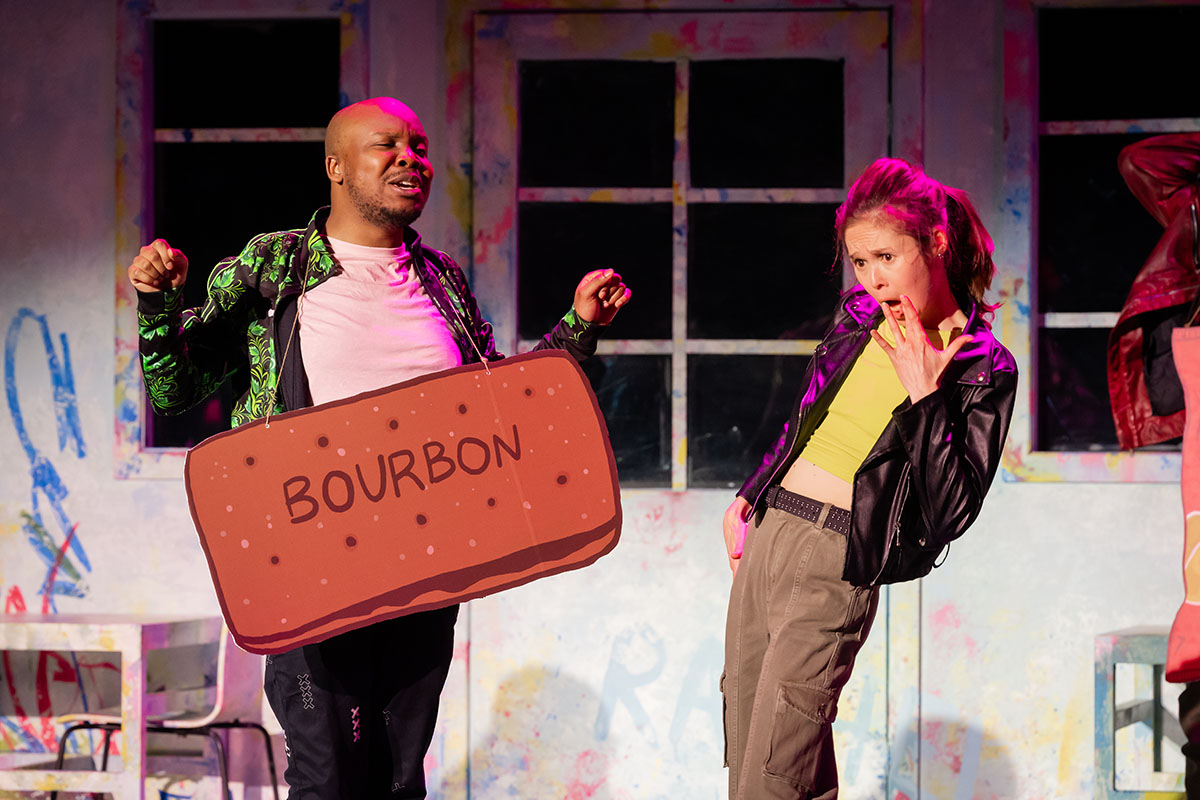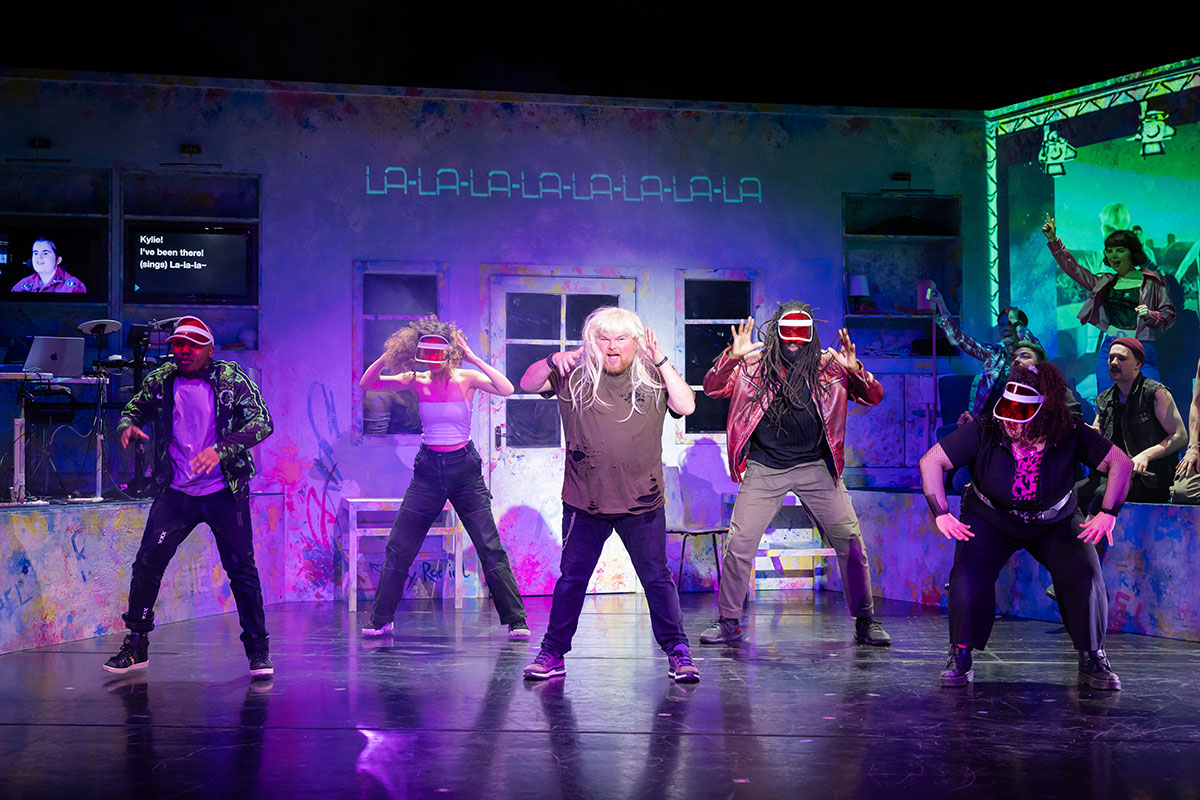 Beginning with greetings from the team, audience members are introduced to Rachel, who we are warned has only a moderate risk of leaving the show halfway through to go to McDonald’s. The exceptional cast members are already stretching in preparation for their first orders from the captain, currently grinning in an armchair before a specially built tech desk. Angled walls beckon towards a fantasy version of Rachel’s living room (designed by Stella Backman), covered in splattered paint, glitter, and graffiti.