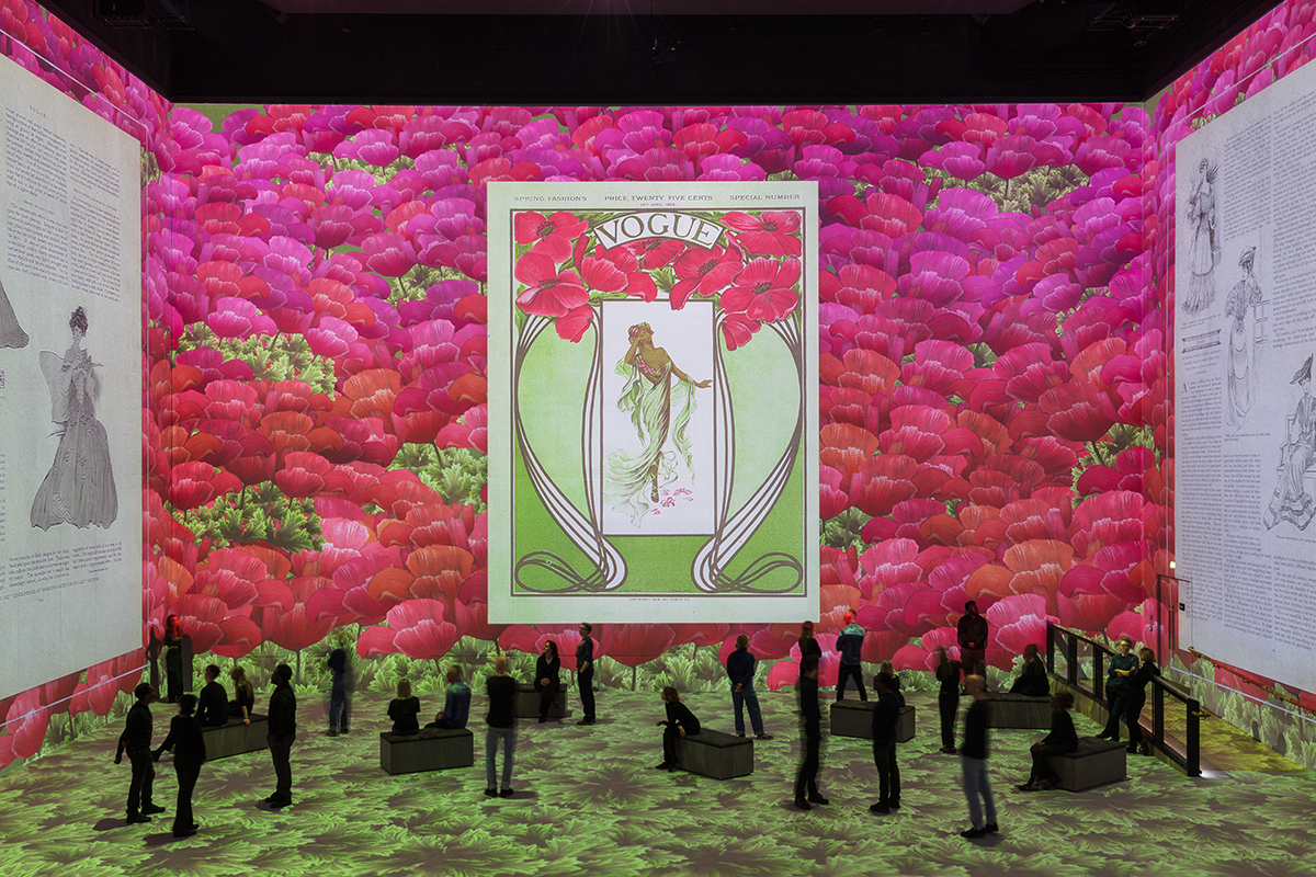 The statement: ‘Putting down the phone at a fashion runway is the most radical thing you can do’ has been attributed to several individuals in fashion commentary, it is certainly true of this experience as the viewer becomes immersed in the theatre, drama and spectacle, not just before you but all around you. The Lightroom space is designed to be enjoyed from all angles and encourages you to move around the space during your visit. The joy, influence and flamboyant spectacles are brought to life by the incredible Lightroom technology. As well as the runway visuals the experience is elevated by immersive sound design, original animation, and a score fusing classical and pop music, which combine to evoke the world of fashion and key moments when iconic runway shows not only graced the pages of Vogue but shifted the cultural landscape.
