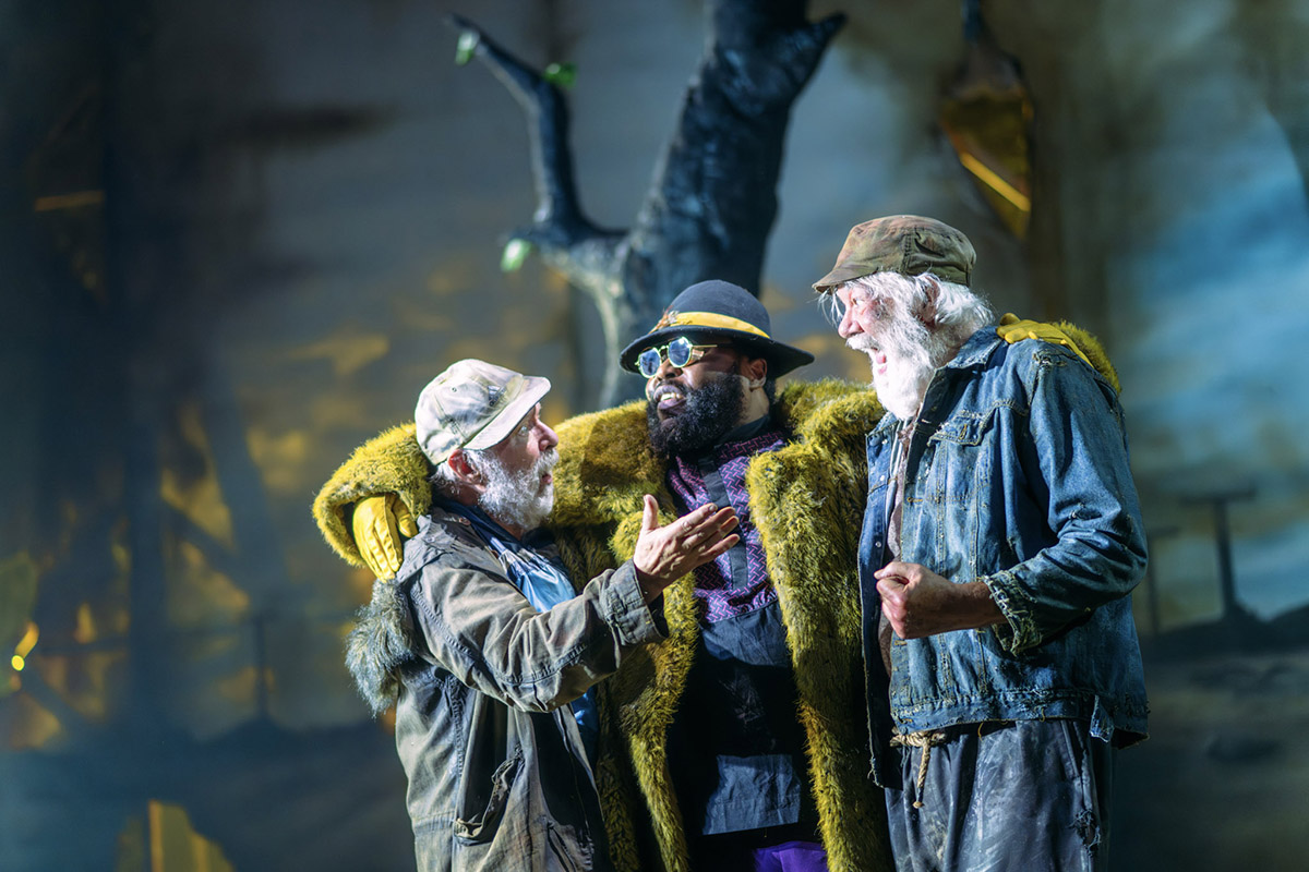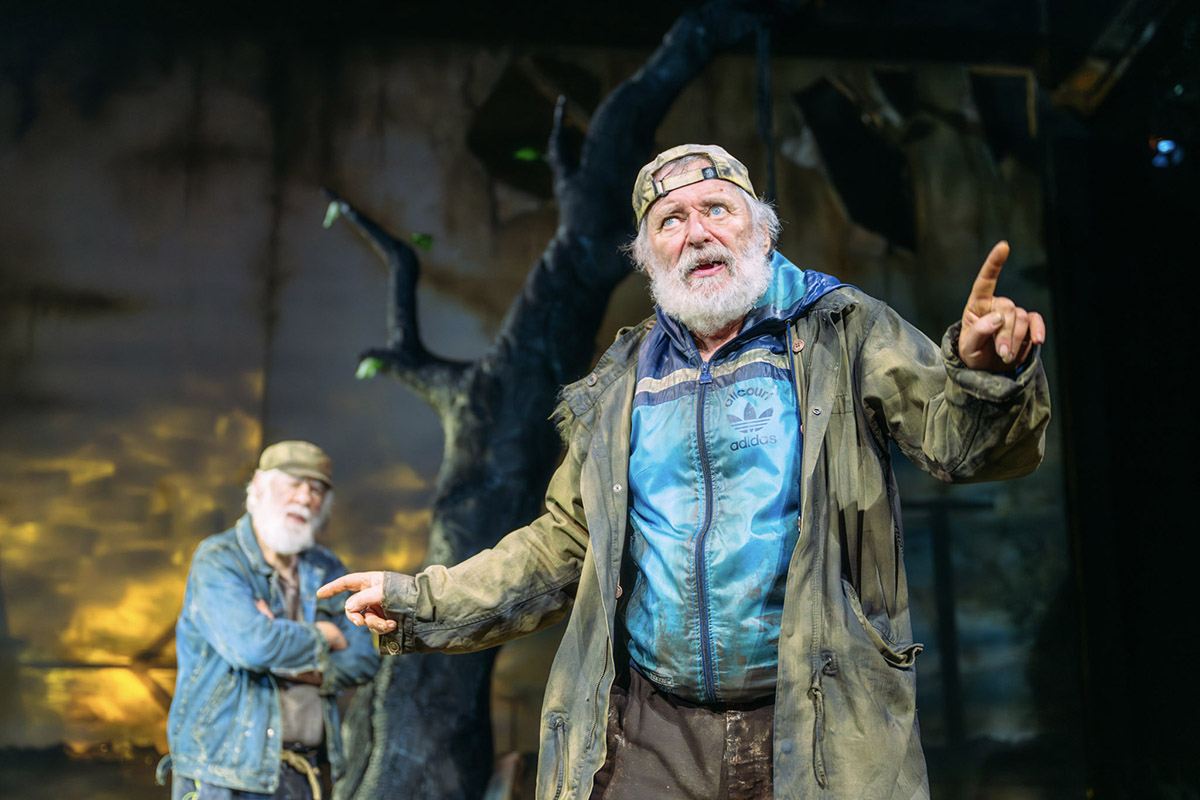 ‘A country road, a tree’. The setting for Beckett’s play is surely as synonymous with the text as ‘blasted heath’ is with King Lear, and in director Dominic Hill’s assured stage setting looks just as desolate. A spectral tree with the mangled remains of a car door wrapped round its trunk dominates the space against a backdrop of never-ending road and bare telegraph poles resembling crucifixes. The production unites lifelong friends and actors Matthew Kelly and George Costigan as Vladimir and Estragon replete with fulsome beards and downbeat tramp attire.